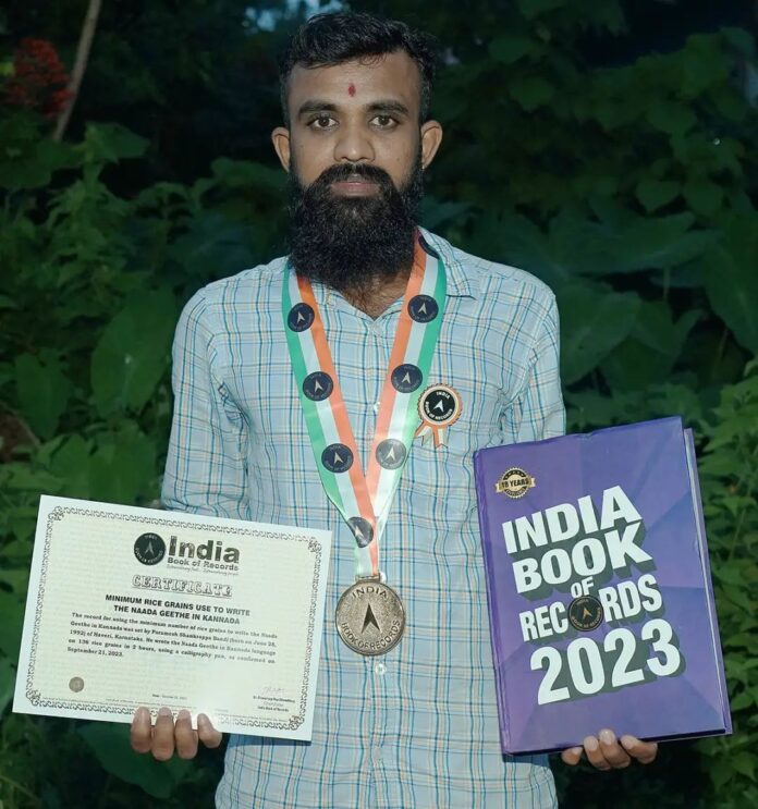 ಸುಬ್ರಹ್ಮಣ್ಯ: ಕಲಾವಿದ ಮೈಕ್ರೊ ಪರಮೇಶ್ ಅಕ್ಕಿ ಕಾಳಿನಲ್ಲಿ ನಾಡಗೀತೆ ಬರೆಯುವ ಮೂಲಕ ಇಂಡಿಯಾ ಬುಕ್ ಆಫ್ ರೆಕಾರ್ಡ್ ಸೇರಿದ್ದಾರೆ. ನಾಡಗೀತೆ ಬರೆಯಲು 136 ಅಕ್ಕಿ ಕಾಳು ಹಾಗೂ 2 ಗಂಟೆ ಸಮಯ ತೆಗೆದುಕೊಂಡಿದ್ದಾರೆ. ಕಡಿಮೆ ಅವಧಿಯಲ್ಲಿ, ಕಡಿಮೆ ಅಕ್ಕಿ ಕಾಳುಗಳನ್ನು ಬಳಸಿಕೊಂಡು ಈ ದಾಖಲೆ ಮಾಡಿರುವುದು ಅವರ ಸಾಧನೆಯಾಗಿದೆ.