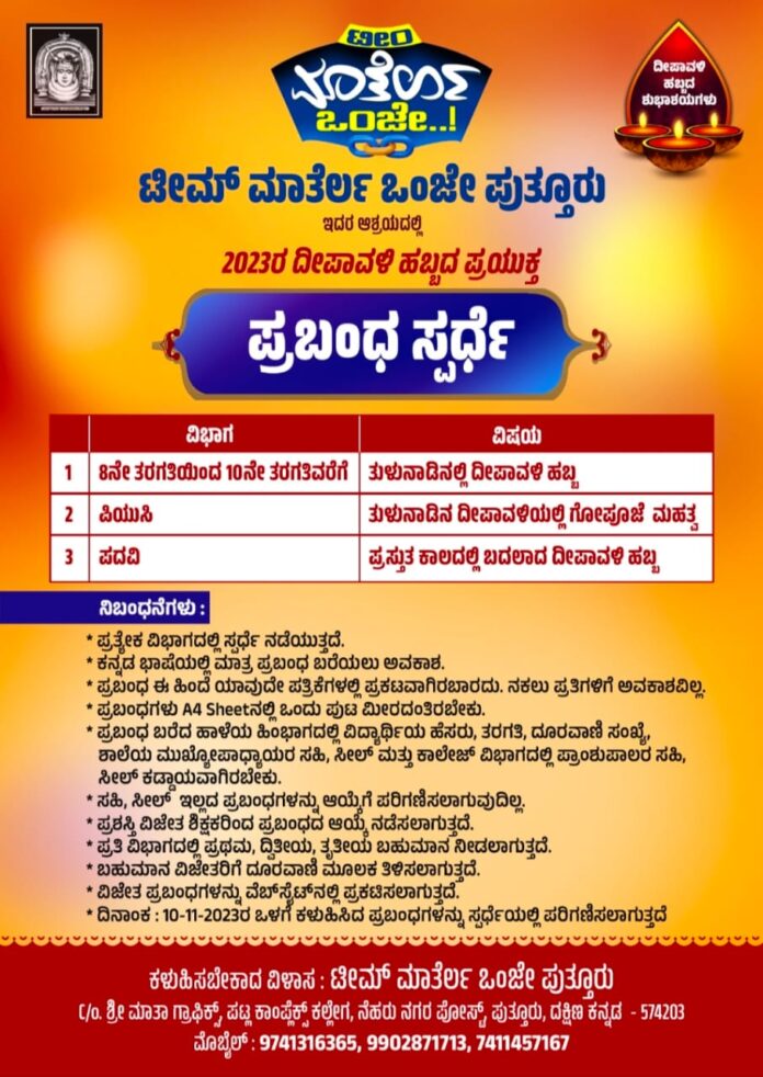 ಪುತ್ತೂರು : ಟೀಮ್ ಮಾತೆರ್ಲ ಒಂಜೇ, ಪುತ್ತೂರು ಇದರ ಆಶ್ರಯದಲ್ಲಿ ದೀಪಾವಳಿ ಪ್ರಯುಕ್ತ ಪ್ರಬಂಧ ಸ್ಪರ್ಧೆಯನ್ನು ಏರ್ಪಡಿಸಲಾಗಿದೆ.